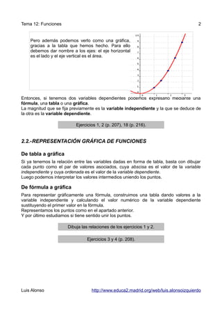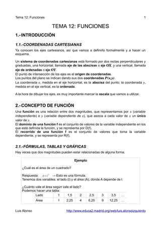 Este documento introduce el tema de las funciones. Explica las coordenadas cartesianas, define una función como una relación entre una variable independiente y una dependiente, y describe cómo se pueden representar funciones mediante fórmulas, tablas y gráficas. También cubre conceptos como continuidad, crecimiento y decrecimiento, máximos y mínimos, simetría y periodicidad. El documento proporciona ejemplos y ejercicios para ilustrar estos conceptos clave sobre funciones.
