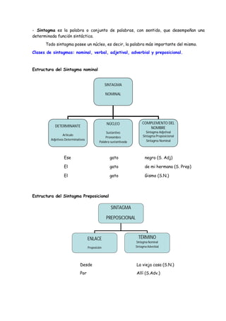 Este documento resume los conceptos básicos de sintaxis. Define el enunciado como la unidad mínima de comunicación y describe dos tipos: oracionales y no oracionales. Explica que los sintagmas son grupos de palabras con función sintáctica y describe los sintagmas nominal, verbal, adjetival, adverbial y preposicional. Finalmente, define los componentes básicos de la oración como el sujeto y el predicado.