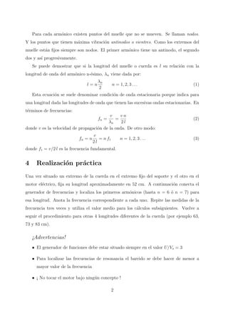 Este documento describe un experimento de laboratorio para estudiar ondas estacionarias en una cuerda elástica. El objetivo es comprender el concepto de onda estacionaria y determinar la velocidad de propagación midiendo las frecuencias de resonancia para diferentes longitudes de la cuerda. Se espera obtener tablas con los valores de frecuencia frente al orden armónico, y gráficas de las cuales se pueden calcular las velocidades de propagación y tensiones de la cuerda.
