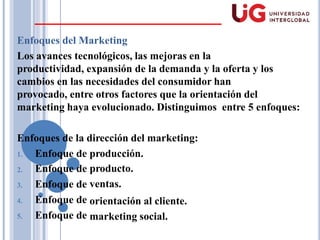 Este documento describe la evolución de cinco enfoques del marketing: producción, producto, ventas, orientación al cliente y marketing social. También discute enfoques futuros como el marketing relacional y experiencial.
