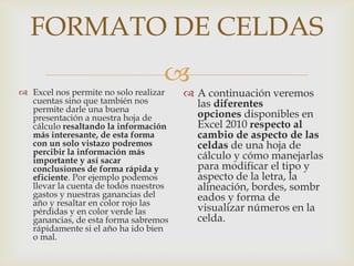 Este documento explica cómo dar formato a las celdas en Excel para cambiar la apariencia de los datos. Describe opciones para modificar el tipo y tamaño de fuente, la alineación de texto, los bordes, sombras y la visualización de números. Explica cómo usar el cuadro de diálogo Formato de celdas y la cinta de opciones para aplicar formato rápidamente a celdas seleccionadas.