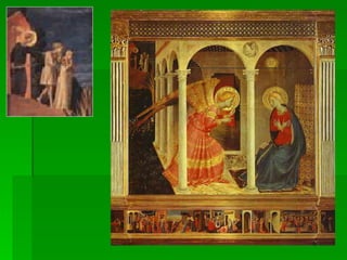 El documento describe la vida y obra del pintor renacentista italiano Guido di Pietro, más conocido como Fra Angelico. Fra Angelico pasó la mayor parte de su vida en el convento de San Domenico de Fiésole, donde realizó numerosas obras pictóricas de temática religiosa. Algunas de sus obras más importantes incluyen Descendimiento, Lamentación sobre el cuerpo de Cristo y Coronación de la Virgen. Más tarde, Fra Angelico trabajó en el Vaticano donde decoró al fresco la Capilla Nicolina con escenas de las vidas