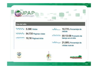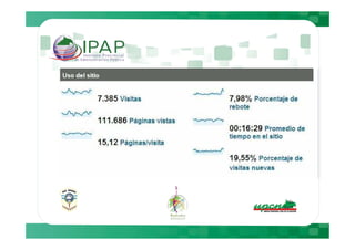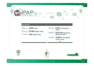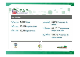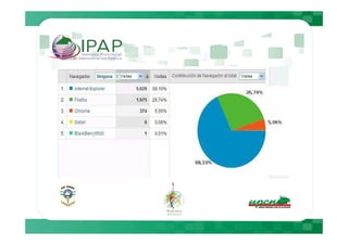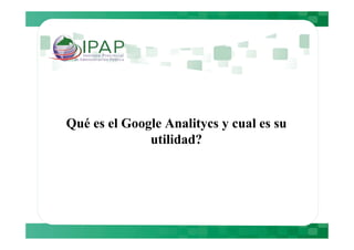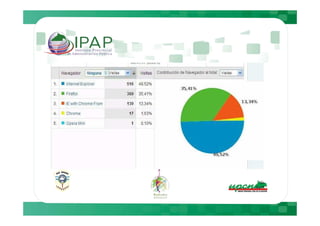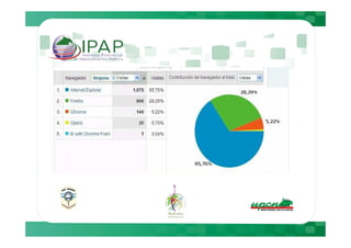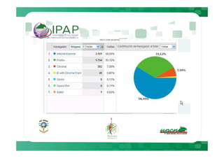 Este documento describe cómo Google Analytics puede proporcionar información sobre el comportamiento de los usuarios en plataformas Moodle, incluyendo métricas como el número de visitantes diarios, tiempo de permanencia y navegadores utilizados. Luego presenta datos específicos de cuatro plataformas Moodle entre el 5 de julio y el 4 de agosto, mostrando variaciones en el tráfico y actividad entre días de la semana y fines de semana. Finalmente, recomienda medidas como sugerir a los usuarios el uso de Mozilla y realizar mantenimientos los fines de