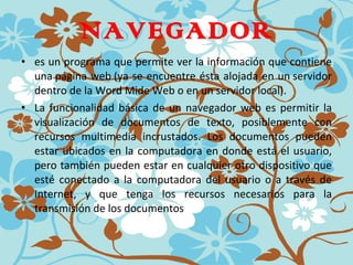 El documento proporciona definiciones de varios términos relacionados con Internet y la World Wide Web. Explica conceptos como ciberespacio, navegador, buscador, enlace, página principal, sitio web y wiki, entre otros. También incluye un crucigrama relacionado con estos términos.