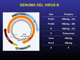 Este documento describe la hepatitis B crónica, incluyendo su genoma, genotipos, subtipos, distribución geográfica, mutaciones frecuentes, prevalencia mundial, modos de transmisión, historia natural, diagnóstico, pacientes con aminotransferasas normales, utilidad de marcadores serológicos y moleculares, determinación de serotipos y genotipos, biopsia hepática, índice de actividad, clasificación de Child-Pugh, agente ideal para el tratamiento y eficacia del interferón alfa