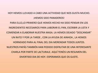 Los niños del 3er grado disfrutaron de una actividad de panadería donde prepararon la masa del pan, la dejaron reposar y luego la hornearon con la ayuda de una compañera. Más tarde, merendaron el pan recién hecho y los padres también pudieron escuchar una charla interesante.