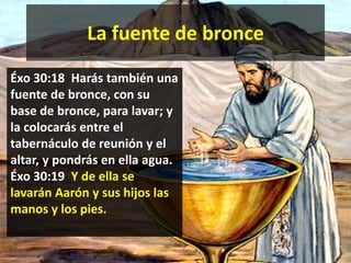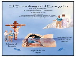 El documento describe el significado simbólico de la fuente de bronce en el santuario bíblico y cómo Jesús es nuestro sacrificio y sumo sacerdote. Luego detalla las características del bautismo bíblico como requiriendo instrucción, arrepentimiento y sumersión en agua, y que si alguien fue bautizado de manera diferente deben ser bautizados correctamente en el nombre de Jesús.