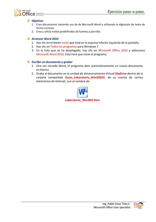 Este documento proporciona instrucciones paso a paso para usar estilos en Microsoft Word 2010. Explica cómo crear y aplicar estilos predefinidos y personalizados, modificar y eliminar estilos existentes, y muestra un ejemplo completo de cómo crear y aplicar un estilo personalizado.
