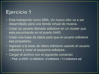 El documento proporciona instrucciones para configurar una base de datos para una tienda de música virtual, incluyendo crear un usuario y base de datos, cargar un esquema, y separar tablas de transacciones en un esquema separado para facilitar la compra y venta.