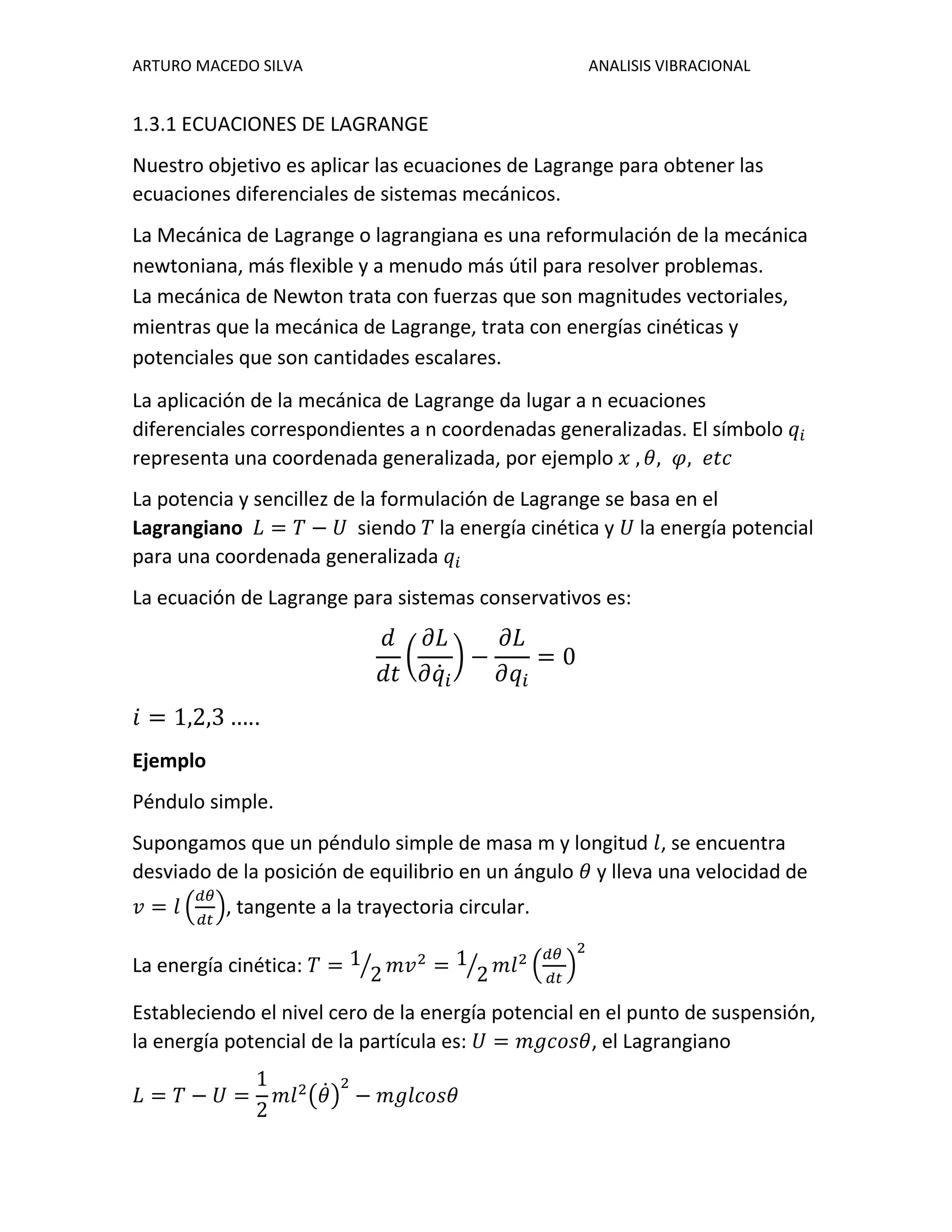 El documento describe el uso de las ecuaciones de Lagrange para modelar sistemas mecánicos. Explica que la mecánica de Lagrange es una reformulación de la mecánica newtoniana que utiliza energías escalares en lugar de fuerzas vectoriales. Aplica las ecuaciones de Lagrange a varios ejemplos como el péndulo simple, un péndulo con resorte y un péndulo colgado de un vagón en movimiento para derivar las ecuaciones diferenciales de movimiento.
