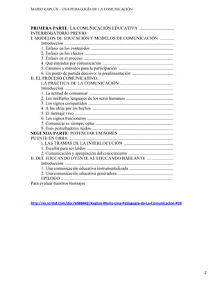 Este documento presenta tres modelos de educación y sus correspondientes modelos de comunicación. El primer modelo se enfoca en los contenidos y promueve una comunicación unidireccional y autoritaria del emisor al receptor. El segundo modelo se centra en los efectos y busca moldear el comportamiento. El tercer y mejor modelo pone énfasis en el proceso de aprendizaje del estudiante y fomenta una comunicación dialógica y participativa.