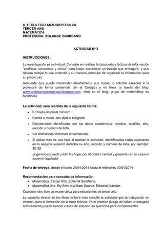 La actividad solicita a los estudiantes realizar investigación individual sobre dos temas matemáticos: ecuaciones con valor absoluto y el plano cartesiano. Para cada tema, los estudiantes deben definir conceptos clave, describir procedimientos y resolver ejemplos. La actividad debe entregarse en papel siguiendo instrucciones específicas y antes de las fechas indicadas.