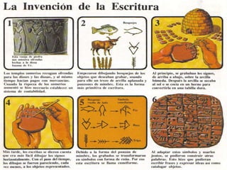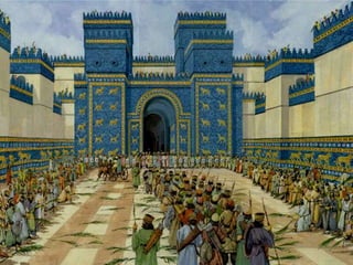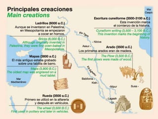 El documento resume aspectos culturales de la antigua Mesopotamia, incluyendo la escultura, arquitectura, cerámica, literatura, ciencia, roles de género, vestimenta, alimentación y entretenimiento. La escultura tenía una función decorativa y representaba dioses y gobernantes con figuras rígidas. La arquitectura se caracterizaba por el uso del ladrillo de barro y la construcción de palacios, templos y zigurats. La sociedad sumeria tenía roles de género definidos donde el hombre era el j