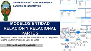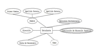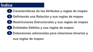 El documento aborda los modelos de entidad-relación y relacional en bases de datos, detallando categorías de atributos como simples, compuestos, multivalorados y derivados, así como las reglas de mapeo de entidades y relaciones. También explora las entidades débiles y fuertes, sus mapeos y restricciones estructurales, además de introducir conceptos de relaciones ternarias y el modelo ER mejorado que incluye generalizaciones y especializaciones. Finalmente, se analizan diversas reglas de mapeo para diferentes tipos de relaciones en bases de datos.