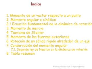 Este documento presenta los conceptos fundamentales de la teoría de momentos y rotación en mecánica de fluidos. Explica el momento de un vector, momento angular, momento de inercia, teorema de Steiner, momento de las fuerzas externas, rotación de un sólido rígido, conservación del momento angular y la segunda ley de Newton aplicada a la dinámica de rotación. Finaliza con una tabla resumen de las analogías entre la dinámica de traslación y rotación.