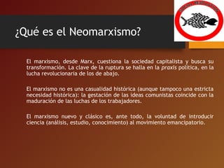 Este documento resume las principales corrientes del pensamiento marxista desde Marx hasta el marxismo ecológico. Comienza explicando el marxismo clásico y su cuestionamiento de la sociedad capitalista. Luego describe el marxismo de la Segunda Internacional y el revisionismo de Bernstein. También analiza las teorías de Rosa Luxemburgo, Lenin, Gramsci y el desarrollo del marxismo occidental y ecológico. Finaliza recomendando varias fuentes bibliográficas sobre la historia del marxismo.