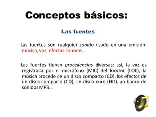 El documento presenta conceptos básicos sobre las fuentes de sonido y los planos de volumen en una emisión de radio. Explica las figuras de montaje para combinar diversas fuentes, y describe la estructura de un guión radiofónico mediante bloques como la sintonía, las secciones y los géneros informativos, de opinión, deportivos, musicales y de entretenimiento. Finalmente, detalla las partes de un guión radiofónico, incluyendo indicaciones de control y locutorio.