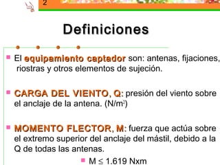 Este documento proporciona normas y recomendaciones para el montaje seguro de sistemas de captación de señales que incluyen antenas, mástiles, anclajes, riostras y otros elementos de sujeción. Detalla los cálculos requeridos para garantizar la resistencia estructural al viento, así como pautas para la colocación de antenas, separaciones mínimas, materiales de fijación, señalización y equipos de seguridad.