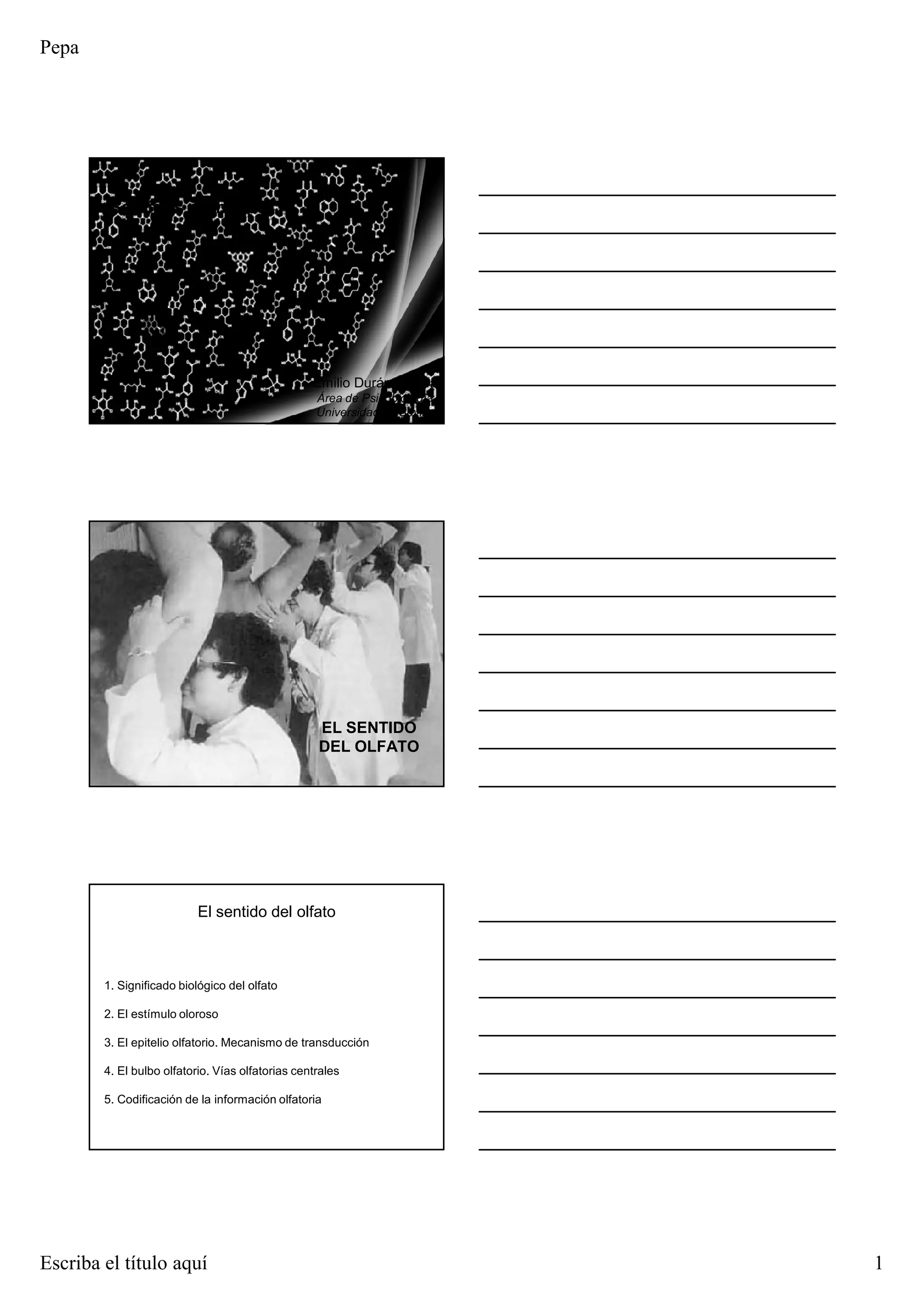 El documento resume los principales aspectos del sentido del olfato. En particular, describe 1) el significado biológico del olfato para la identificación de alimentos, depredadores y reconocimiento social, 2) los mecanismos de transducción en el epitelio olfatorio que convierten las moléculas olorosas en señales nerviosas, y 3) cómo la información olfatoria se codifica espacial y temporalmente en el bulbo y corteza olfatoria para permitir la discriminación de miles de olores.