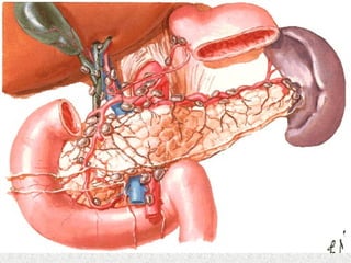 Este documento describe la exploración ecográfica del páncreas, incluyendo su ecoanatomía, tamaño y posición típicos. Explica cinco planos de corte utilizados para estudiar diferentes partes del páncreas, como la cabeza, el cuello y el cuerpo. Estos cortes longitudinales y transversales permiten evaluar la estructura y medidas del páncreas.