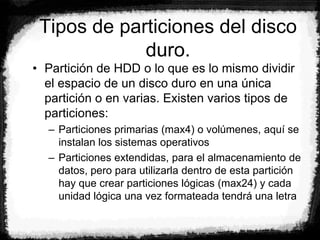 El documento describe los diferentes tipos de particiones de disco duro, incluidas las particiones primarias, extendidas y lógicas. Explica que las particiones primarias se utilizan para instalar sistemas operativos, mientras que las particiones extendidas y lógicas se usan para el almacenamiento de datos. También describe los elementos clave de cada sector de arranque de volumen, como el bloque de parámetros del disco y el código de arranque del volumen.
