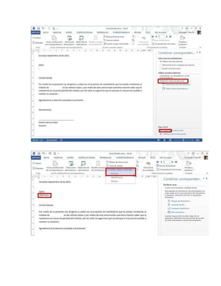 Este documento explica el proceso de combinar correspondencia en Microsoft Word para crear cartas personalizadas a partir de una plantilla y una base de datos. Se describen los pasos: 1) Crear una carta modelo con espacios para los datos; 2) Crear una base de datos en Excel con la información; 3) Usar la herramienta de correspondencia en Word para vincular los datos y generar cartas individuales.