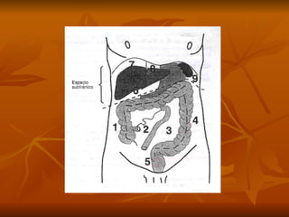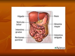 El documento describe la anatomía, fisiología, fisiopatología y clínica de la peritonitis. Resume que el peritoneo es una membrana formada por dos capas que recubre los órganos abdominales. La peritonitis es una inflamación del peritoneo causada comúnmente por infecciones bacterianas o sustancias químicas, manifestándose clínicamente por dolor abdominal, náuseas, fiebre y síntomas generales de infección.