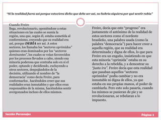 Paulo Freire, nacido en 1921 en Brasil, fue un educador revolucionario que propuso una "educación popular" que empoderara a los sectores marginados y oprimidos. Criticó las prácticas educativas existentes que mantenían a los estudiantes en un estado de sumisión y conformismo. En su lugar, promovió un enfoque basado en el diálogo y la participación que permitiera a los estudiantes desarrollar un pensamiento crítico y la capacidad de cambiar sus propias realidades. Sus ideas tuvieron un gran impacto y