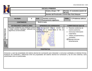 Este documento resume una lección de matemáticas sobre sumas y restas para estudiantes de primer grado. La lección incluye actividades grupales e individuales para practicar sumas y restas con números hasta 100. También presenta un problema de suma y resta con tres hermanos y sus piedras recolectadas. El documento evalúa el progreso de los estudiantes y propone adaptaciones para un estudiante específico.
