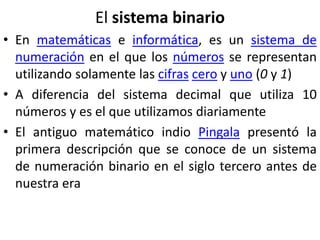 El documento explica el sistema binario, el cual representa números utilizando solo los dígitos 0 y 1. Aunque fue descrito originalmente por matemáticos antiguos, Leibniz documentó el sistema binario moderno en el siglo 17. Hoy en día, los sistemas binarios se usan ampliamente en computadoras, donde la información se almacena y transmite como una serie de bits que representan valores 0 y 1. Los procesadores de 64 bits pueden procesar más datos que los de 32 bits debido a que tienen carriles/bits adicionales para la información
