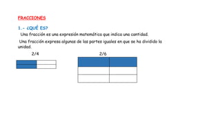 Este documento explica las fracciones, incluyendo su definición como una expresión matemática que indica una cantidad dividida en partes iguales, con un numerador y denominador. También cubre cómo comparar fracciones, encontrar fracciones equivalentes, realizar cálculos con fracciones como suma, resta, multiplicación y división, y convertir fracciones a decimales.