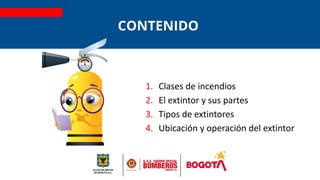 Este documento describe las clases de incendios, los tipos de extintores y sus características, y la operación y ubicación adecuada de los extintores. Identifica cinco clases principales de incendios (A, B, C, D y K) y describe los agentes extintores y colores de los cilindros para cada clase. También cubre las partes de un extintor, la normatividad aplicable, y los pasos para operar un extintor de manera segura.