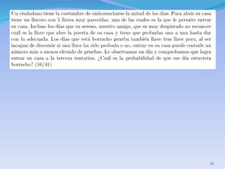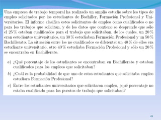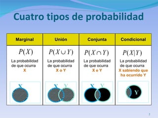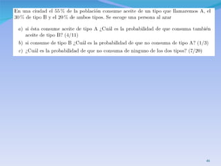 El documento presenta conceptos básicos de probabilidad como sucesos, probabilidad marginal, conjunta y condicional. Explica la probabilidad condicionada y cómo calcularla. También introduce la independencia de sucesos y la ley de probabilidad total para calcular la probabilidad de un suceso a partir de la probabilidad condicionada a otros sucesos.