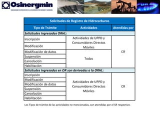 El documento describe los procedimientos para la atención de solicitudes de informes técnicos favorables y registro de hidrocarburos. Explica el proceso de supervisión operativa para registros de hidrocarburos obtenidos mediante declaración jurada, incluyendo el objetivo, alcance, plan de supervisión y diagrama de flujo del proceso.