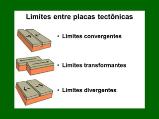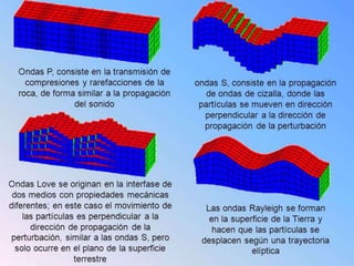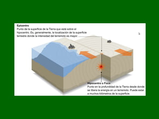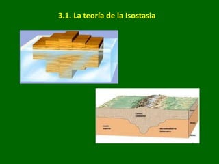 El documento resume conceptos clave sobre los procesos geológicos y estructuras resultantes. Explica la teoría de la isostasia, que propone que las montañas están compensadas por masa en profundidad para mantener el equilibrio de la corteza. También describe los movimientos tectónicos como terremotos y vulcanismo, que ocurren cuando las placas tectónicas convergen, divergen o se deslizan lateralmente. Finalmente, define los diferentes tipos de sismos según su profundidad y causa.