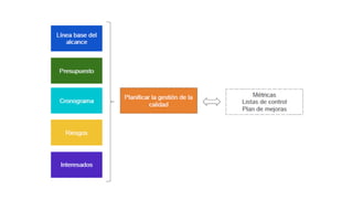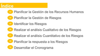 Este documento describe los procesos de planificación de gestión de riesgos, recursos humanos, costos, calidad y adquisiciones. Explica cada proceso, incluyendo entradas, herramientas, técnicas y salidas. Se enfoca en identificar, analizar cualitativa y cuantitativamente los riesgos del proyecto, y desarrollar planes para gestionar los recursos humanos, costos, calidad y adquisiciones.