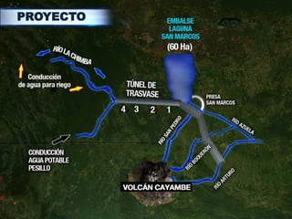 Este documento presenta información sobre el proyecto de riego "Cayambe - Pedro Moncayo", incluyendo las fechas de inicio y término, el avance hasta mayo de 2012 del 19%, la inversión total de $196 millones, los beneficios como el riego de 14,700 hectáreas y un incremento en la producción de alimentos y leche, la creación de 7,000 puestos de trabajo, y el abastecimiento de agua potable a 170,000 beneficiarios en 5 cantones.