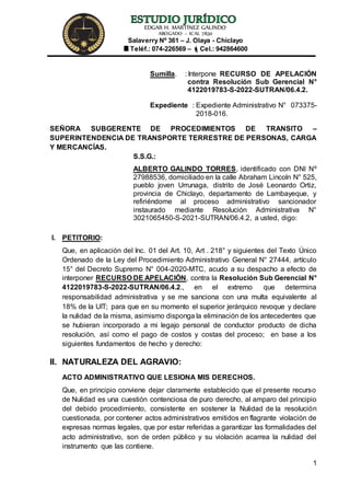 El documento presenta un recurso de apelación contra una resolución administrativa que sancionó a Alberto Galindo Torres con una multa equivalente al 18% de la UIT por cometer una infracción de tránsito. El recurso alega la prescripción de la acción debido al tiempo transcurrido y solicita la nulidad de la resolución por falta de motivación y no pronunciarse sobre la acumulación de cinco procesos administrativos sancionadores relacionados con un solo hecho continuado.