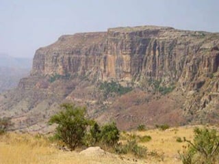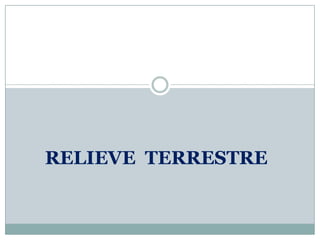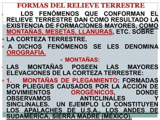 Este documento describe las principales formas del relieve terrestre como montañas, mesetas, llanuras y valles, y explica cómo se forman y clasifican. También describe los procesos de erosión como la eólica, pluvial, fluvial, glacial y marina que modifican gradualmente el relieve terrestre a través del desgaste de las rocas y suelos.