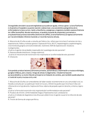 Este documento presenta 14 casos clínicos con sus respectivas preguntas sobre agentes causales, formas de transmisión y diagnósticos de diversas infecciones. Los casos incluyen infecciones por parásitos como Strongyloides stercoralis, Trichuris trichiura y Entamoeba histolytica, hongos como Candida albicans, Cryptococcus neoformans y Aspergillus spp., y otros agentes como Tripanosoma cruzi, Onchocerca volvulus y Chlamydia trachomatis.