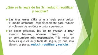 La regla de las tres erres (reducir, reutilizar y reciclar) es una guía para cuidar el medio ambiente y reducir la cantidad de desechos generados. Reducir significa simplificar el consumo de productos directos comprando menos envases. Reutilizar es darle el mayor uso posible a las cosas antes de desecharlas. Reciclar somete los materiales a un proceso para volver a utilizarlos y reducir el uso de nuevos materiales.