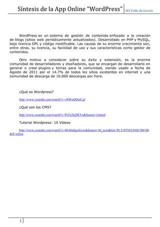 WordPress es un sistema de gestión de contenido gratuito y de código abierto enfocado en la creación de blogs. Se desarrolló en PHP y MySQL y su popularidad se debe a su licencia GPL, facilidad de uso, y su capacidad para gestionar contenido. La gran comunidad de desarrolladores que crean plugins y temas también ha contribuido a su éxito, siendo usado por más del 14% de los sitios web.