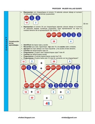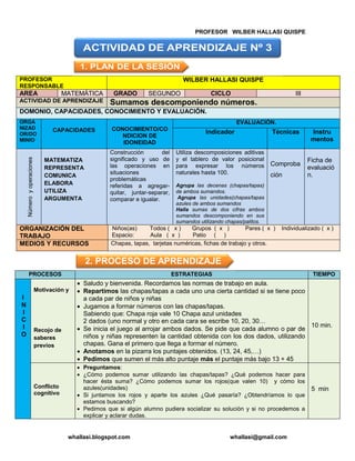 Este documento describe una lección sobre la suma descomponiendo números para estudiantes de segundo grado. El profesor Wilber Hallasi Quispe utiliza chapas y tarjetas numéricas para enseñar a los estudiantes a agrupar las decenas y unidades al sumar números de dos cifras descomponiéndolos en sus partes. Los estudiantes practican resolviendo problemas de suma usando este método y demuestran su comprensión resolviendo ejercicios de manera individual, en parejas y grupos.