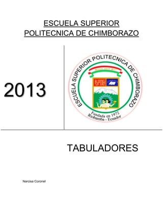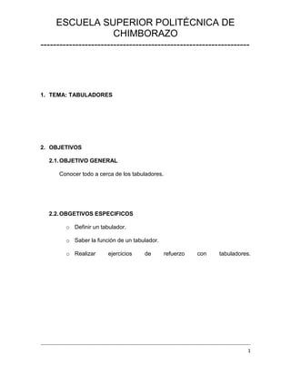 Este documento describe los tabuladores en Microsoft Word. Explica que un tabulador permite dar diferentes alineaciones de texto en una línea y crear tablas de contenido e índices. Detalla los cinco tipos de tabuladores y cómo establecerlos, modificarlos y eliminarlos. El objetivo es que los lectores entiendan la función y uso de los tabuladores en Word.