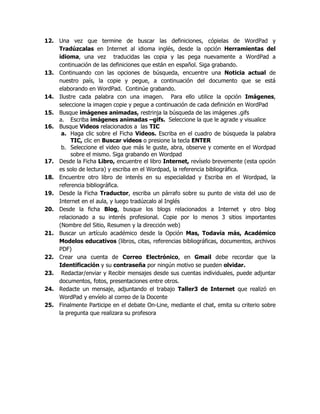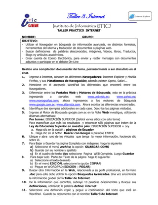 Este documento proporciona instrucciones para un taller práctico sobre el uso de Internet. El objetivo es enseñar a los estudiantes a buscar y encontrar varios tipos de información en línea como definiciones, imágenes, videos, libros y artículos académicos. También cubre cómo crear una cuenta de correo electrónico y participar en debates en línea. Las instrucciones guían a los estudiantes a través de varias actividades como navegar por sitios web, usar motores de búsqueda, traducir texto, y comunicarse