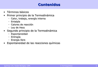 Este documento presenta los conceptos fundamentales de la termoquímica en 3 oraciones: Introduce los términos básicos de la termoquímica como calor de reacción y entalpía de reacción. Explica los dos principios de la termodinámica, incluyendo que el primer principio se refiere a la conservación de la energía y que el segundo principio se refiere a la espontaneidad de los procesos. Finalmente, detalla conceptos como estados estándar y cómo se usan las entalpías de formación