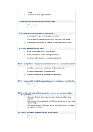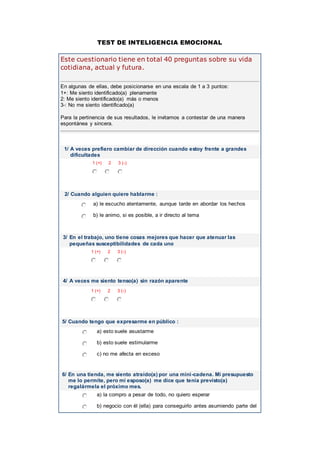 Este documento presenta un cuestionario de 40 preguntas sobre inteligencia emocional. Las preguntas cubren temas como la capacidad de enfrentar dificultades, escuchar a otros, manejar estrés, compararse con los demás, y expresar emociones. Las respuestas varían de 1+ a 3- para indicar el grado en que la persona se identifica con cada afirmación. El propósito es evaluar la inteligencia emocional de manera espontánea y sincera.