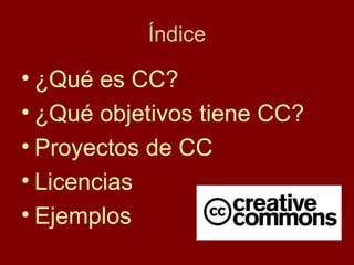 Creative Commons es una organización sin ánimo de lucro que desarrolla licencias para permitir el uso y distribución de contenido de una manera más flexible. Ofrece varias licencias que permiten diferentes niveles de uso comercial, modificación y distribución de obras derivadas. El objetivo es reducir las barreras legales de la creatividad a través de nuevas leyes y tecnologías.