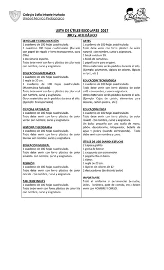 El documento lista los útiles escolares requeridos para los cursos de 3ro y 4to básico en el Colegio Sofía Infante Hurtado. Se especifican los cuadernos, lápices y otros materiales necesarios para cada asignatura, incluyendo Lenguaje y Comunicación, Educación Matemática, Ciencias Naturales, Historia y Geografía, Educación Musical, Religión, Taller de Inglés, Artes, Educación Tecnológica y Educación Física. Todos los útiles deben ir en forros de plást