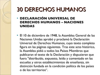 El documento presenta los 30 artículos de la Declaración Universal de Derechos Humanos aprobada por las Naciones Unidas en 1948. La declaración establece derechos fundamentales como el derecho a la vida, la libertad, la igualdad, la seguridad personal, la privacidad, la libertad de expresión, el derecho a un juicio justo y otros derechos civiles, políticos, económicos, sociales y culturales.